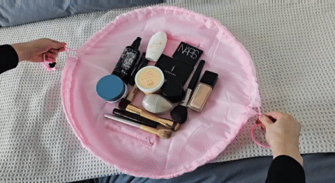 • With our innovative makeup bag that opens like a mat, you'll never have to worry about forgetting to put your lipstick back in your bag while traveling. Simply place it on the mat and zip it up, knowing your favorite products are safely stored for your next glam session!